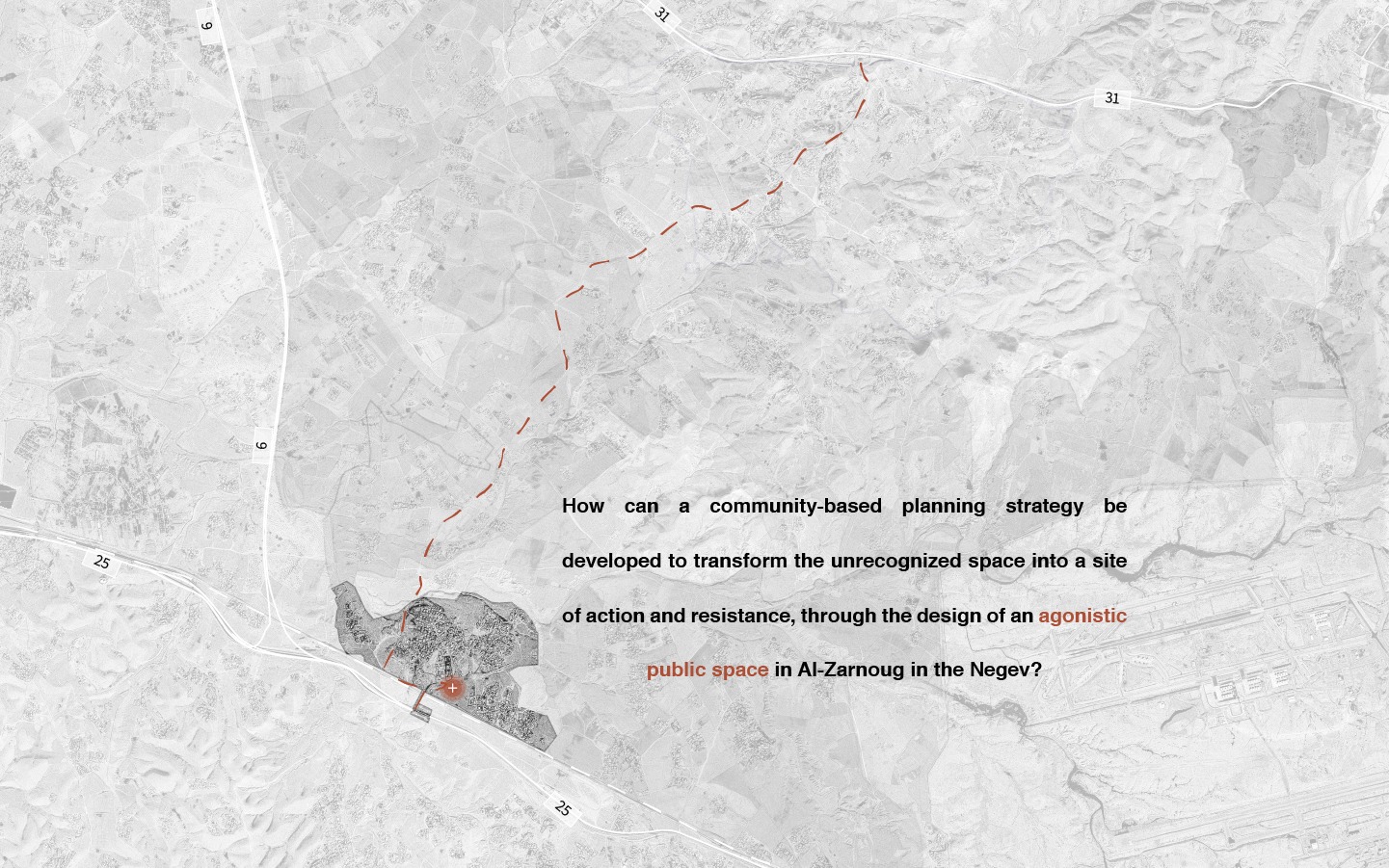 הפרויקט בוחן את פיתוחו של מרחב ציבורי המתהווה מתוך הכפרים הבדואיים הבלתי־מוכרים בנגב, בהתבסס על תאוריית הפעולה האגוניסטית והארגון העצמי של לקלאו ומוף (Laclau & Mouffe). גישה זו מניחה כי מאבק פוליטי מול הדרה אינו מתחיל מן המדינה, אלא מיכולתה של הקהילה לייצר מרחבים ציבוריים אלטרנטיביים המעצבּים מחדש את יחסיה למקום ולדינמיקות הכוח.