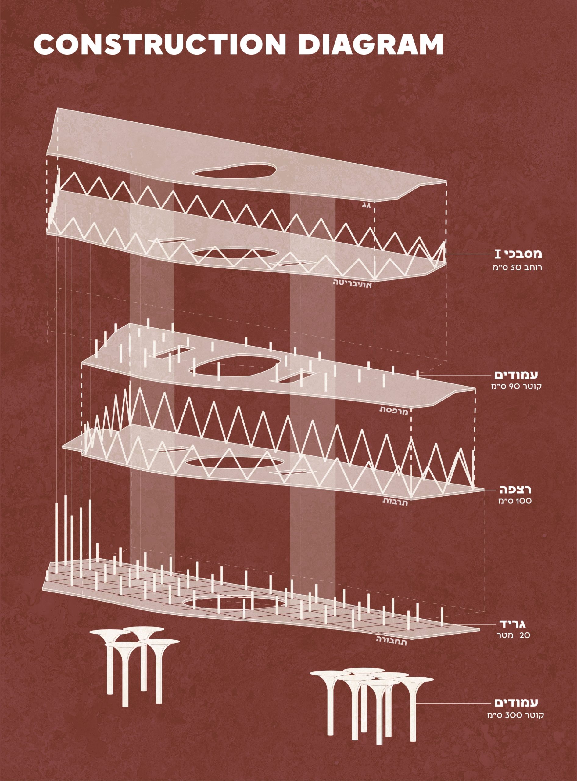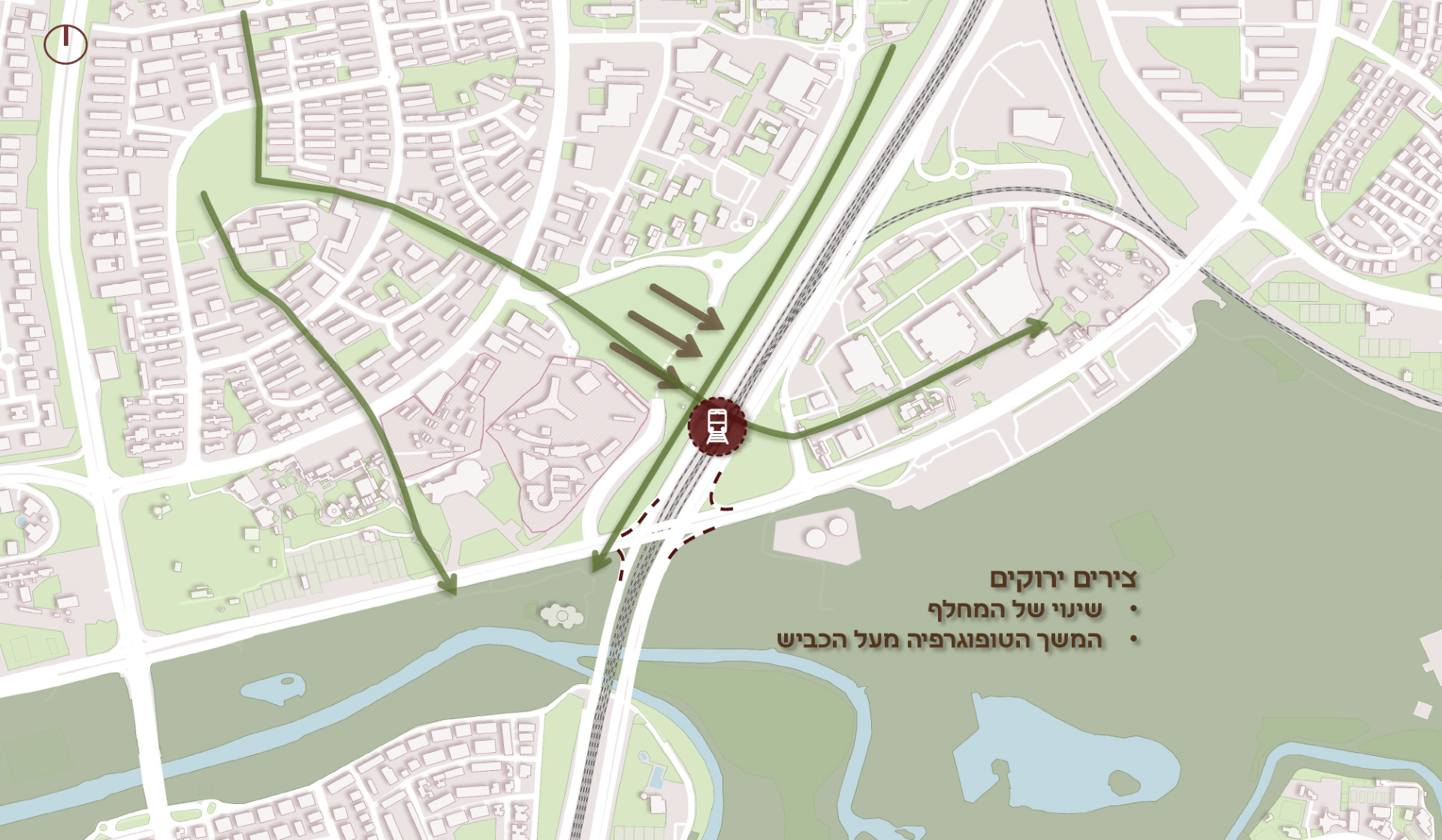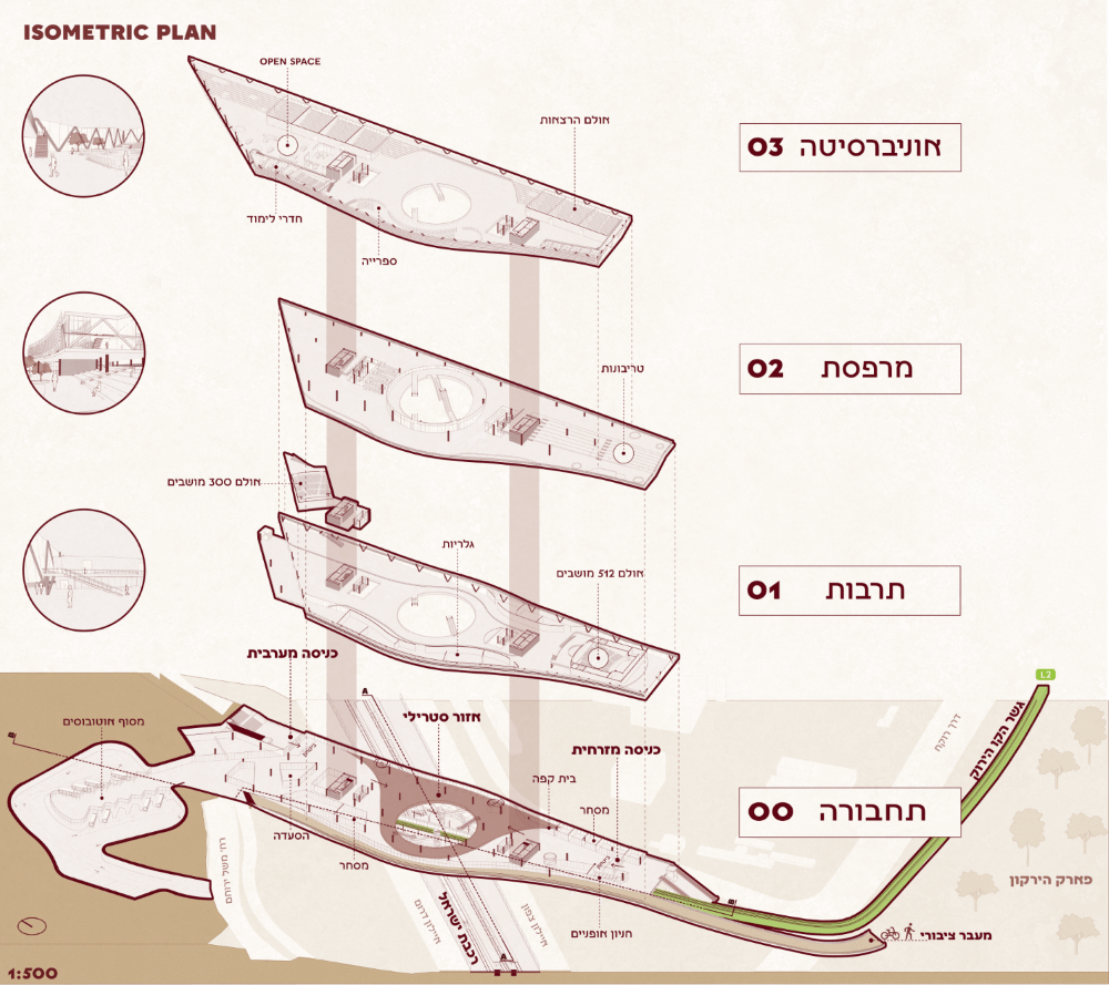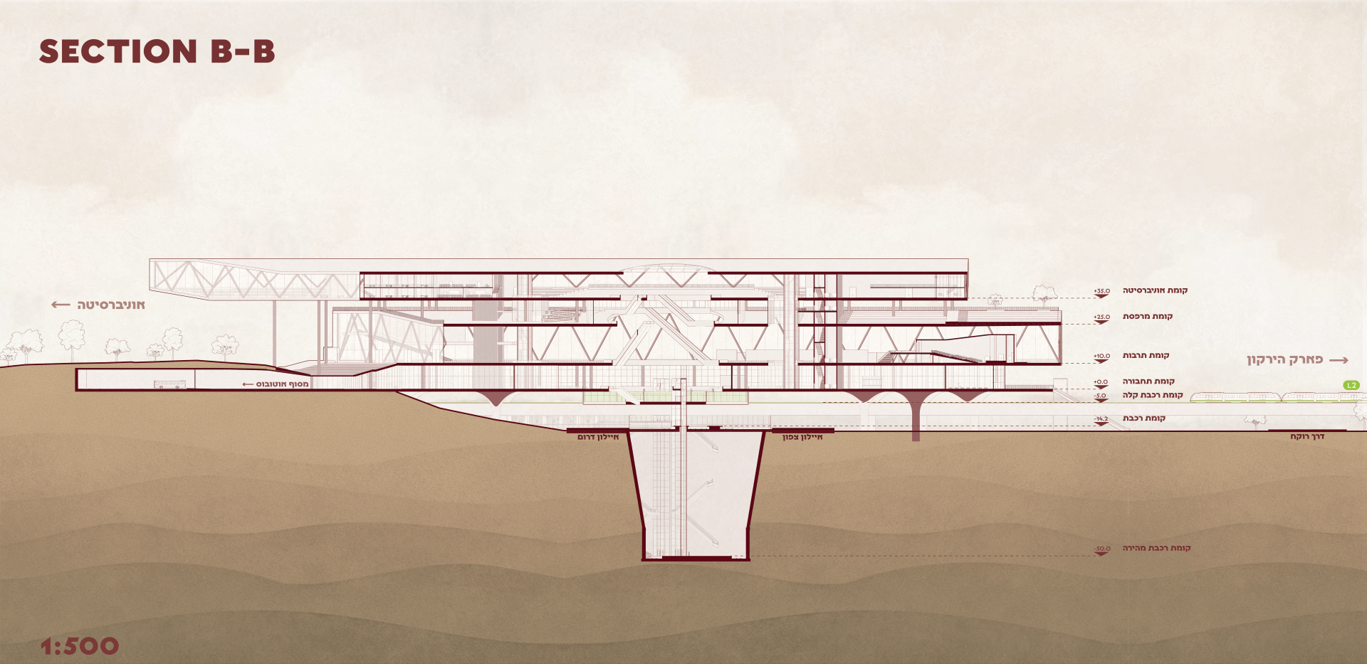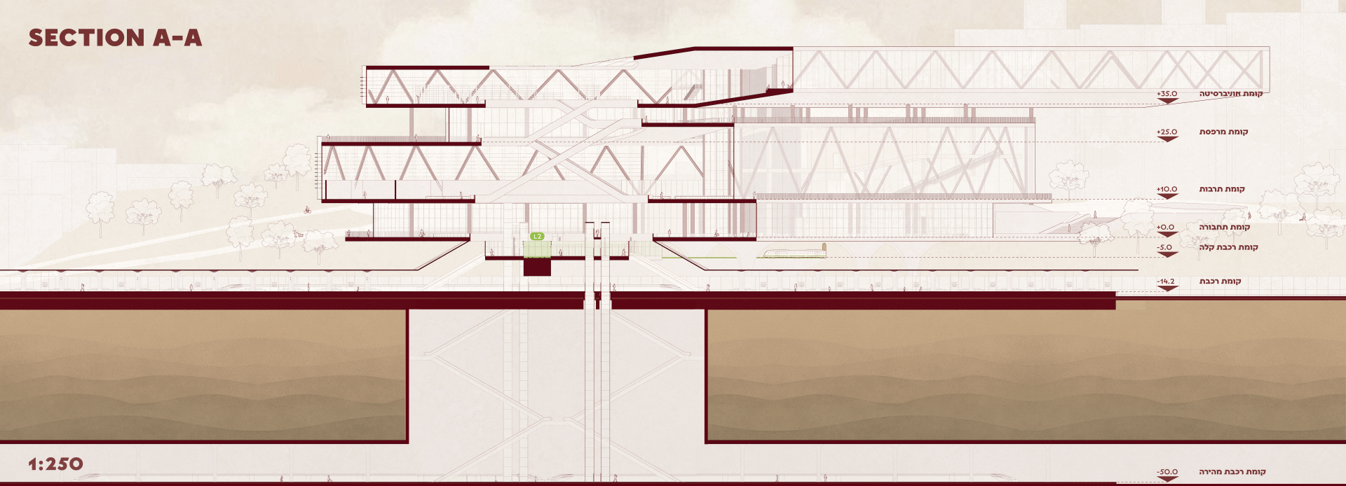 The project focuses on promoting **urban connectivity** at the **Tel Aviv University train station** – the northern gateway to Tel Aviv. It proposes an integrated **transportation hub** that enables fast and efficient transitions between intercity rail, light rail, high-speed rail, and bus systems. Functioning as a **bridge structure above the Ayalon corridor**, the building connects the Exhibition Grounds with the University, restoring the **urban continuity** for pedestrians and cyclists. Beyond serving as a point of transit, the station operates as a **vibrant and dynamic urban space** that links **culture, academia, and community**, creating a **seamless movement experience** and clear **visual connections** between the different layers of the structure.