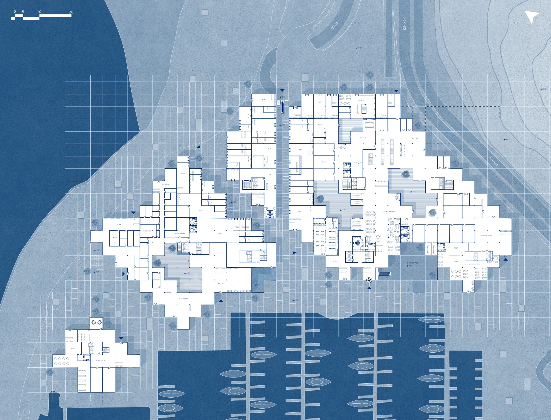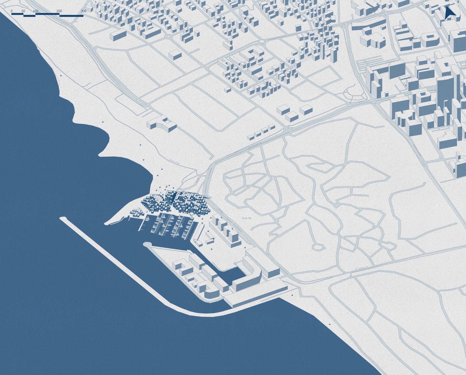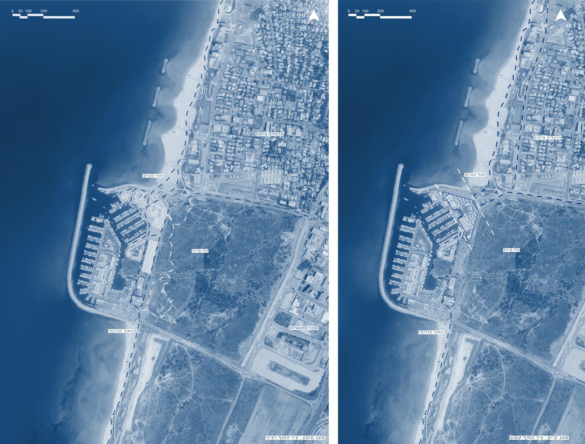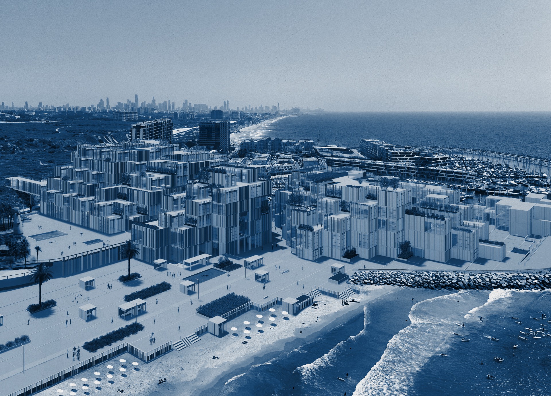 its transformation into an open structure that is connected and integrated into the urban fabric. The building includes a mixed-use program of employment, commerce, a maritime museum, and an educational center linked to seamanship. The project realizes the tremendous potential embedded in the mall’s unique surroundings, located at the meeting point between the city and the sea, in the heart of Herzliya’s coastal area. The entire design is based on the building’s existing grid and is translated into a new architectural language, including façade design inspired by the masts of the boats moored in the marina. The planning strategy strengthens the urban connections to the surroundings: restoring the continuity of the coastal promenade that was interrupted, and deepening the connection with the archaeological site of Tel Michal — a green natural gem of historical and scenic value. Inspired by the principles of Healing Architecture, the closed mall is transformed into an open, inviting, and restorative public space that connects between nature and the city.
