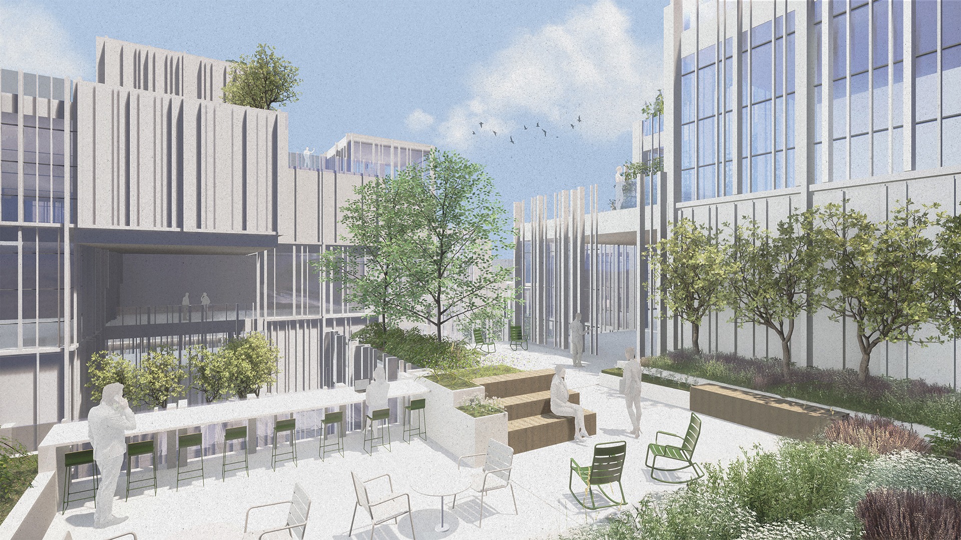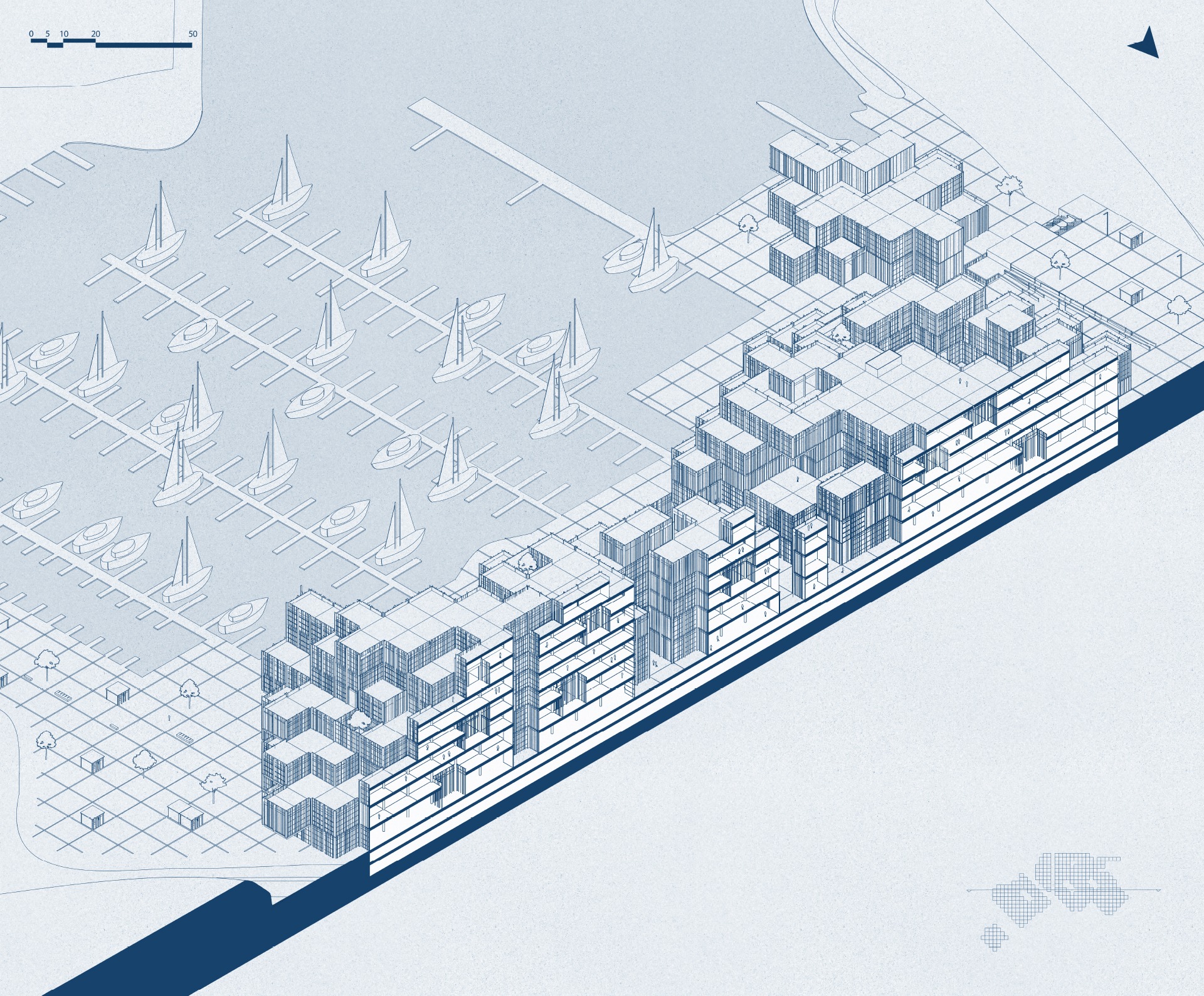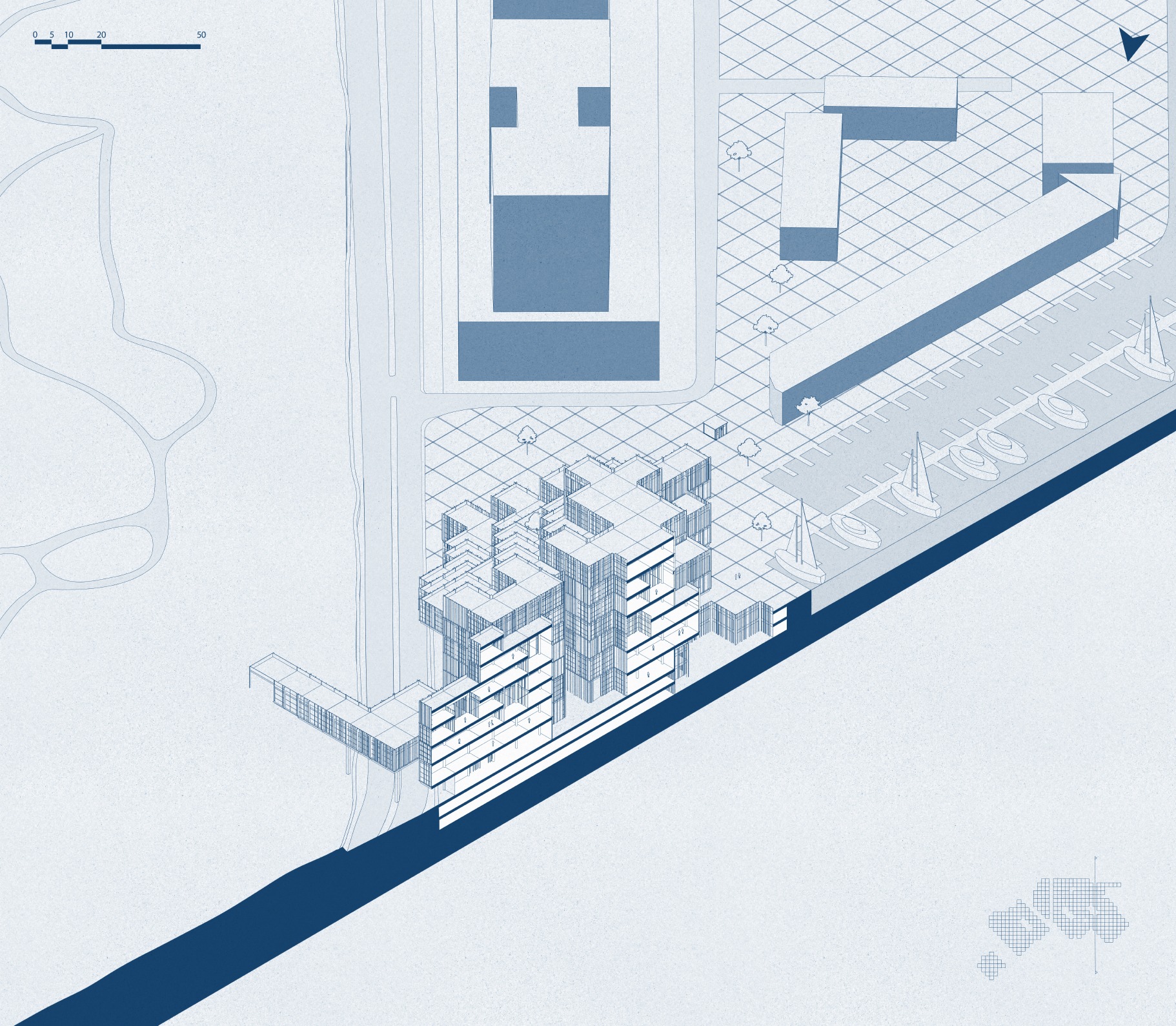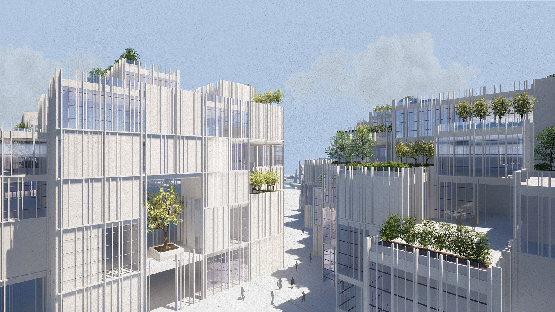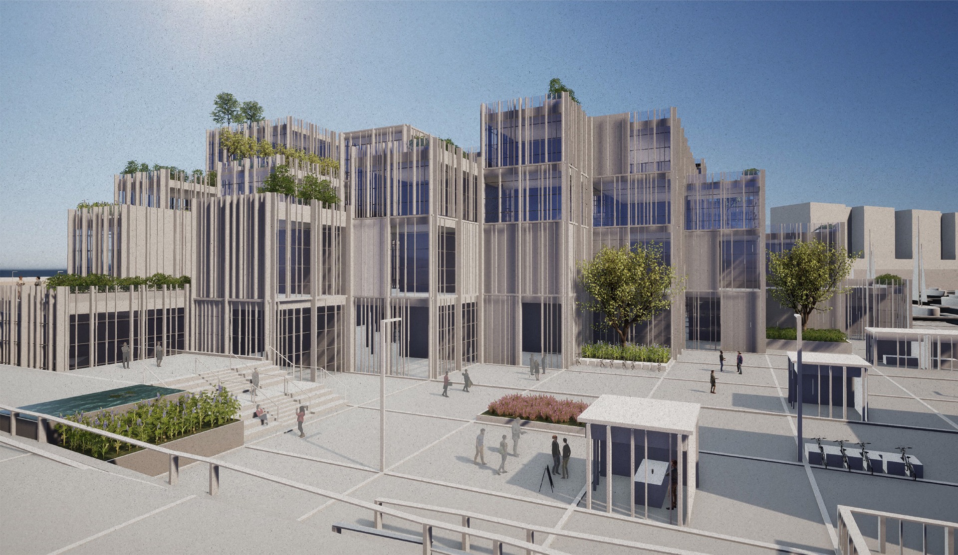 its transformation into an open structure that is connected and integrated into the urban fabric. The building includes a mixed-use program of employment, commerce, a maritime museum, and an educational center linked to seamanship. The project realizes the tremendous potential embedded in the mall’s unique surroundings, located at the meeting point between the city and the sea, in the heart of Herzliya’s coastal area. The entire design is based on the building’s existing grid and is translated into a new architectural language, including façade design inspired by the masts of the boats moored in the marina. The planning strategy strengthens the urban connections to the surroundings: restoring the continuity of the coastal promenade that was interrupted, and deepening the connection with the archaeological site of Tel Michal — a green natural gem of historical and scenic value. Inspired by the principles of Healing Architecture, the closed mall is transformed into an open, inviting, and restorative public space that connects between nature and the city.
