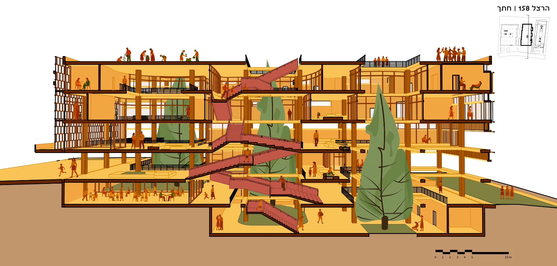 The project is located at the southern end of Herzl Street in Tel Aviv, a charged intersection between the remnants of Sakhnat Abu Kabir within Park HaHorshot to the west and Giv’at Herzl to the east, an area transitioning from an industrial past toward a new communal future.