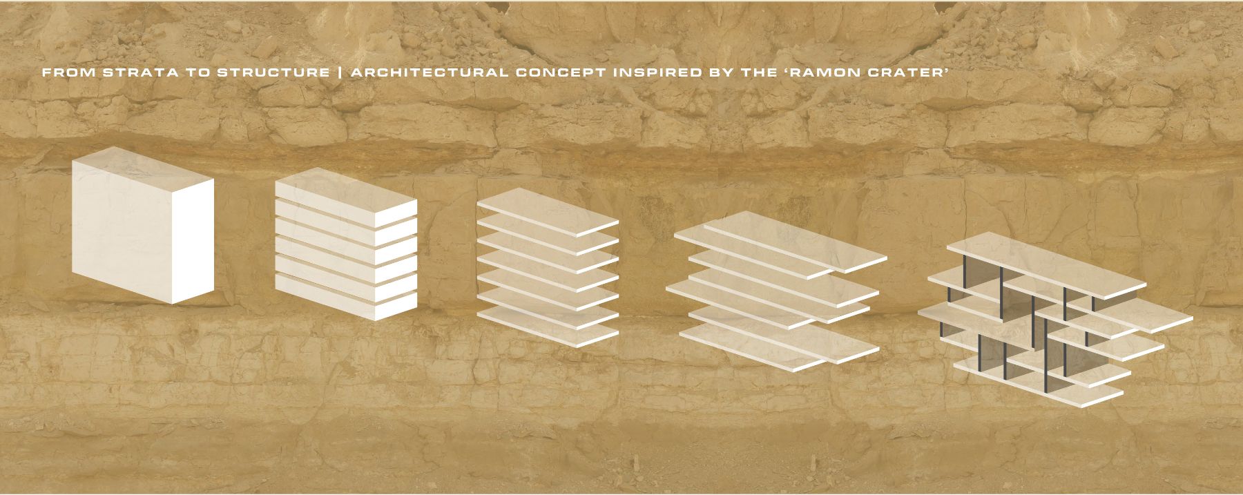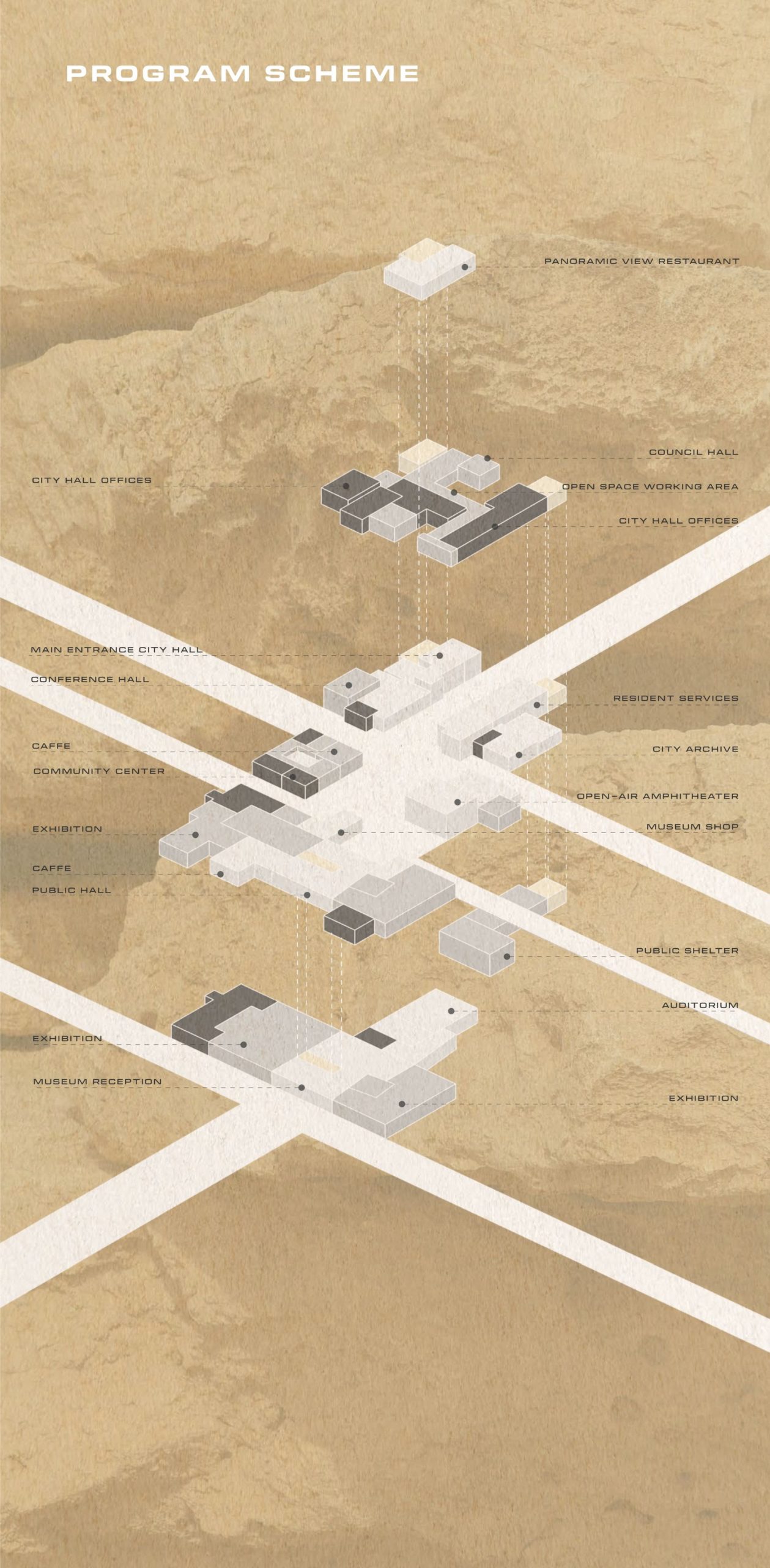 הפרויקט עוסק בתכנון מרכז עירוני חדש בלב מצפה רמון- ישוב עירוני הנמצא בפני תקופת שינוי וצמיחה. לפי תוכנית המתאר החדשה הישוב צפוי לגדול פי שלושה, להתרחב ולשלב שימושים חדשים, עם דגש על פיתוח התיירות כמנוע כלכלי מרכזי. התוכנית הקיימת אינה נותנת מענה לחיבור פיזי בין הישוב הותיק לשכונות החדשות, ובין כלל איזורי המגורים לפארק שפת המכתש ולחוויה התיירותית. מצב זה עלול להוביל לניתוק חברתי בין התושבים הותיקים, החדשים והתיירים, ולמשבר זהות עירוני. כיום החוויה התיירותית במצפה רמון מתבססת כמעט אך ורק על נוף המכתש, מה שהופך אותו לאטרקציה הבלעדית, אך כישוב עירוני עליו להציע מוקדי עניין נוספים שיהפכו אותו לאטרקטיבי עבור מגוון רחב יותר של אוכלוסייה, כך שיהיה ניתן להנות מחוויה תיירותית הוליסטית ואותנטית, ללא תלות בשעות האור ובמזג האוויר. הרעיון לפרויקט נולד מתוך מחשבה על כוחו של המרחב הציבורי לתת ביטוי גם למתחים חברתיים ופוליטיים וגם לתלות הדדית ולשיתופי פעולה. מצפה רמון הנמצאת בתהליך שינוי וקליטה של קבוצות אוכלוסייה חדשות, היא כעת מרחב ציבורי בעל גיוון חברתי וטעון פוליטית. מתוך כך, התכנון המפורט מציע כיכר עירונית ובית עירייה חדשים אשר ימוקמו בלב מע"ר המחבר בין חלקי הישוב. הכיכר העירונית כוללת בין היתר מוזאון לאמנות מדברית, אודטוריום ומרכז קהילתי, המשמשים כמרחב ציבורי משותף ותוסס. החיבור בין העיר למכתש, ובין התיירים לתושבים, הוא חלק מהותי בתכנון מתוך ההבנה שמצפה רמון אינו עוד ישוב עירוני רגיל, אלא מקום בעל ערך נופי, תרבותי ותיירותי יוצא דופן.
