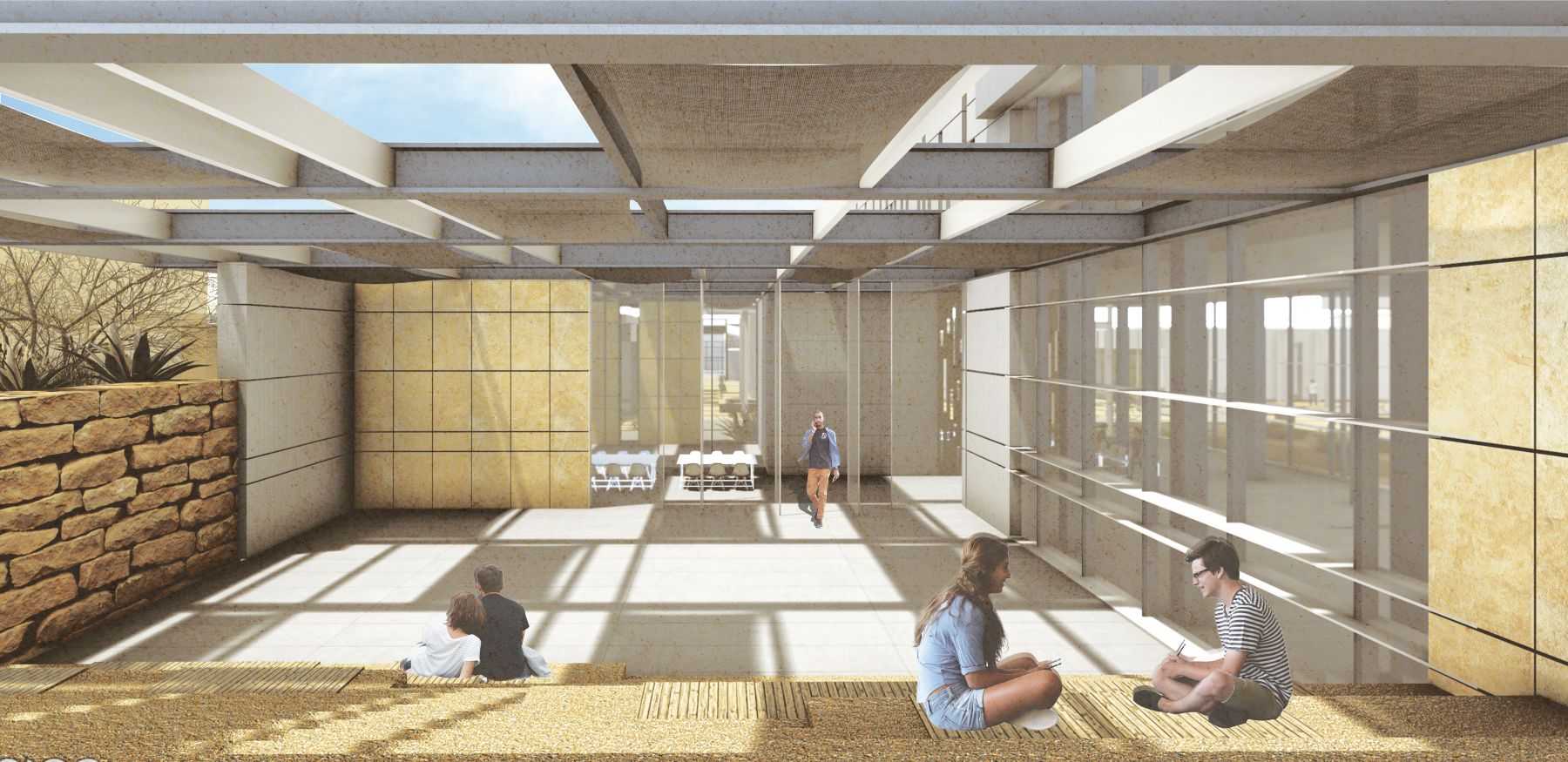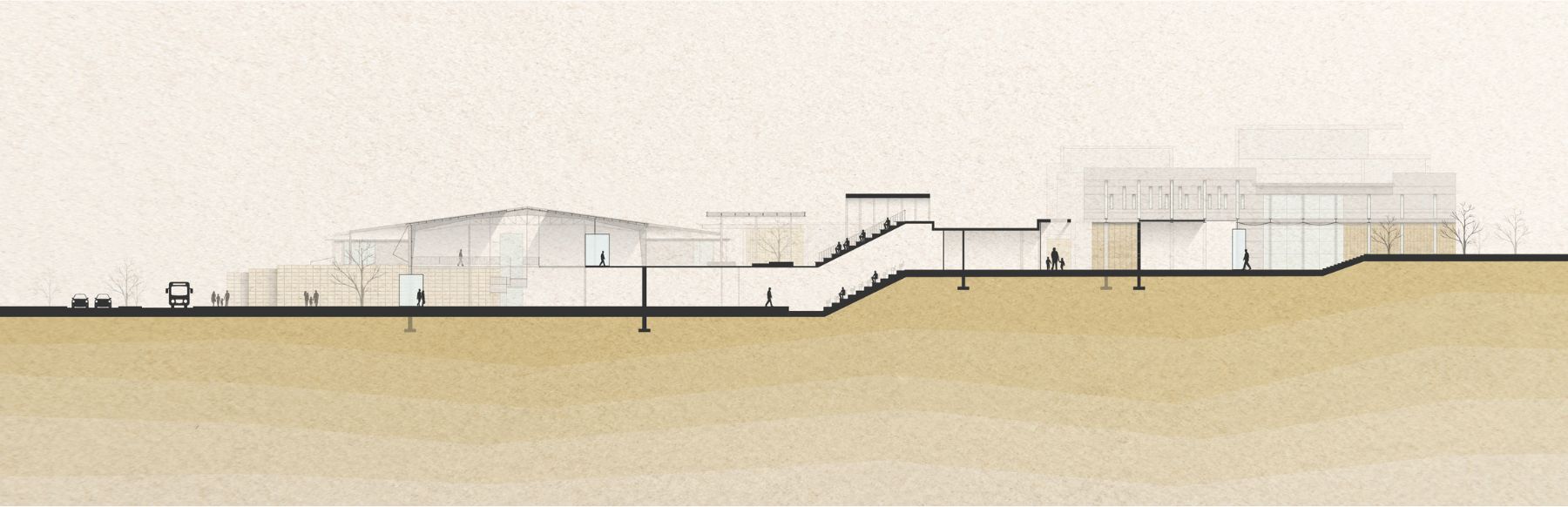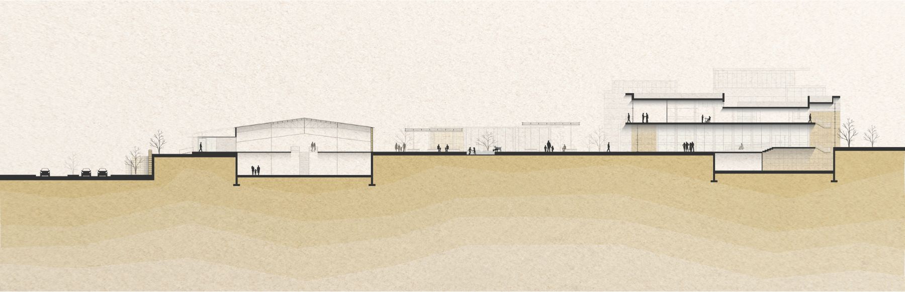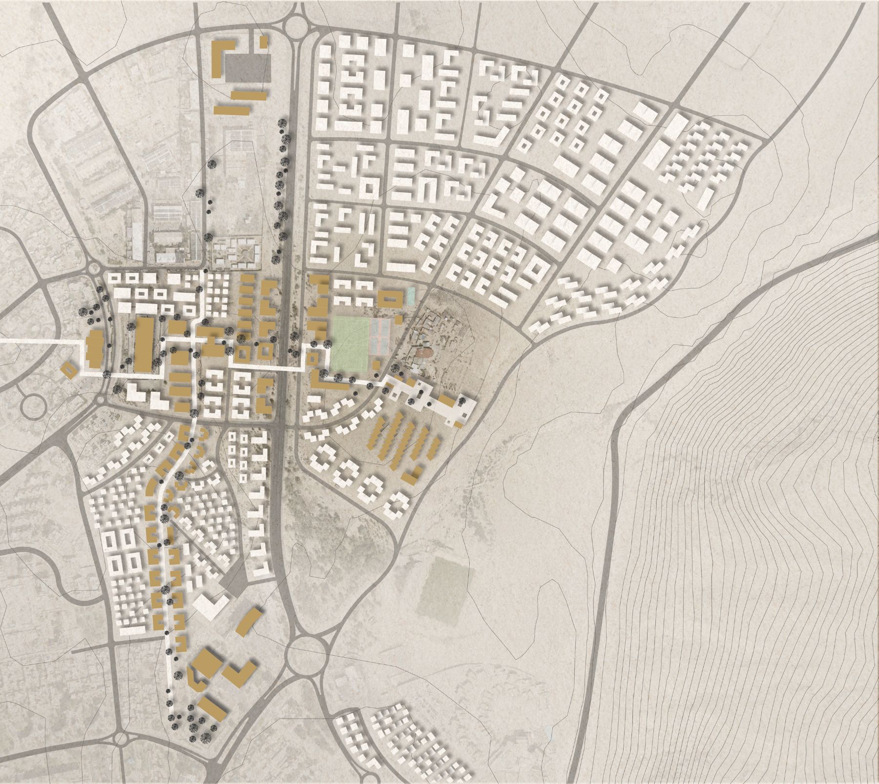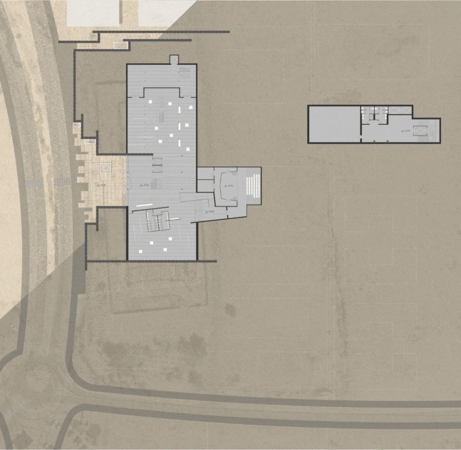 The project focuses on planning a new urban center in the heart of Mitzpe Ramon — a town currently undergoing a period of transformation and growth. According to the new master plan, the town is expected to triple in size, expand, and incorporate new land uses, with an emphasis on tourism development as a central economic driver. However, the existing plan does not provide a physical connection between the old town and the new neighborhoods, nor between the residential areas, the crater’s edge park, and the broader tourist experience. This situation risks creating a social divide between long-time residents, newcomers, and visitors, potentially leading to an urban identity crisis. Today, tourism in Mitzpe Ramon relies almost exclusively on the crater landscape, making it the town’s sole attraction. Yet, as an urban settlement, it must also offer additional focal points of interest to appeal to a wider range of audiences — allowing for a holistic and authentic tourist experience that is not dependent on daylight or weather conditions. The idea for the project emerged from a reflection on the power of public space to express both social and political tensions, as well as interdependence and collaboration. Mitzpe Ramon, currently absorbing new populations and undergoing significant change, represents a socially diverse and politically charged public realm. The proposed detailed plan introduces a new urban square and municipal building located at the heart of a central activity zone that connects the different parts of the town. The urban square includes, among other elements, a museum of desert art, an auditorium, and a community center, all functioning as a vibrant shared public space. The connection between the town and the crater — and between residents and visitors — is a fundamental aspect of the design, grounded in the understanding that Mitzpe Ramon is not just another urban settlement, but a place of exceptional scenic, cultural, and touristic value.