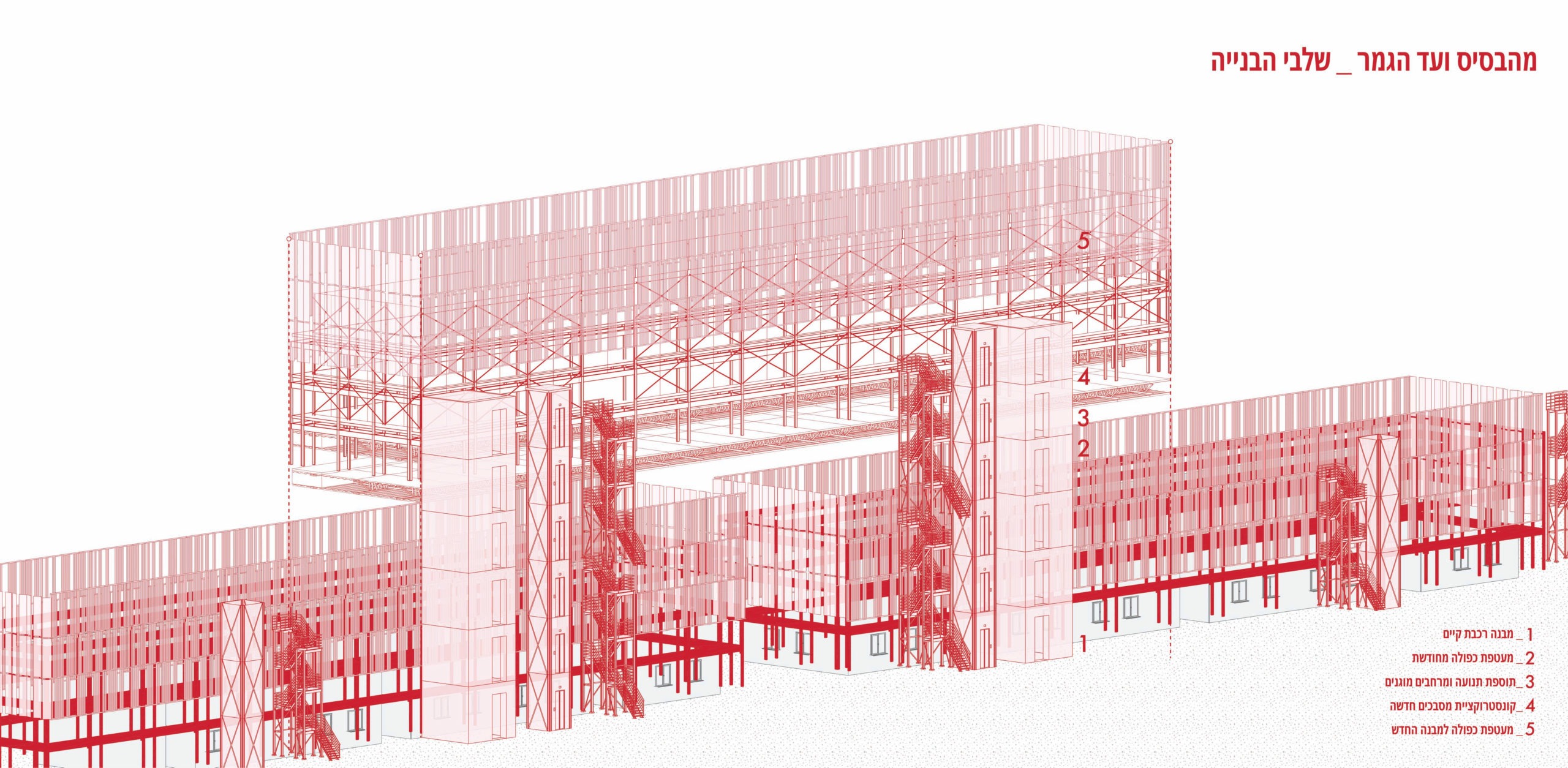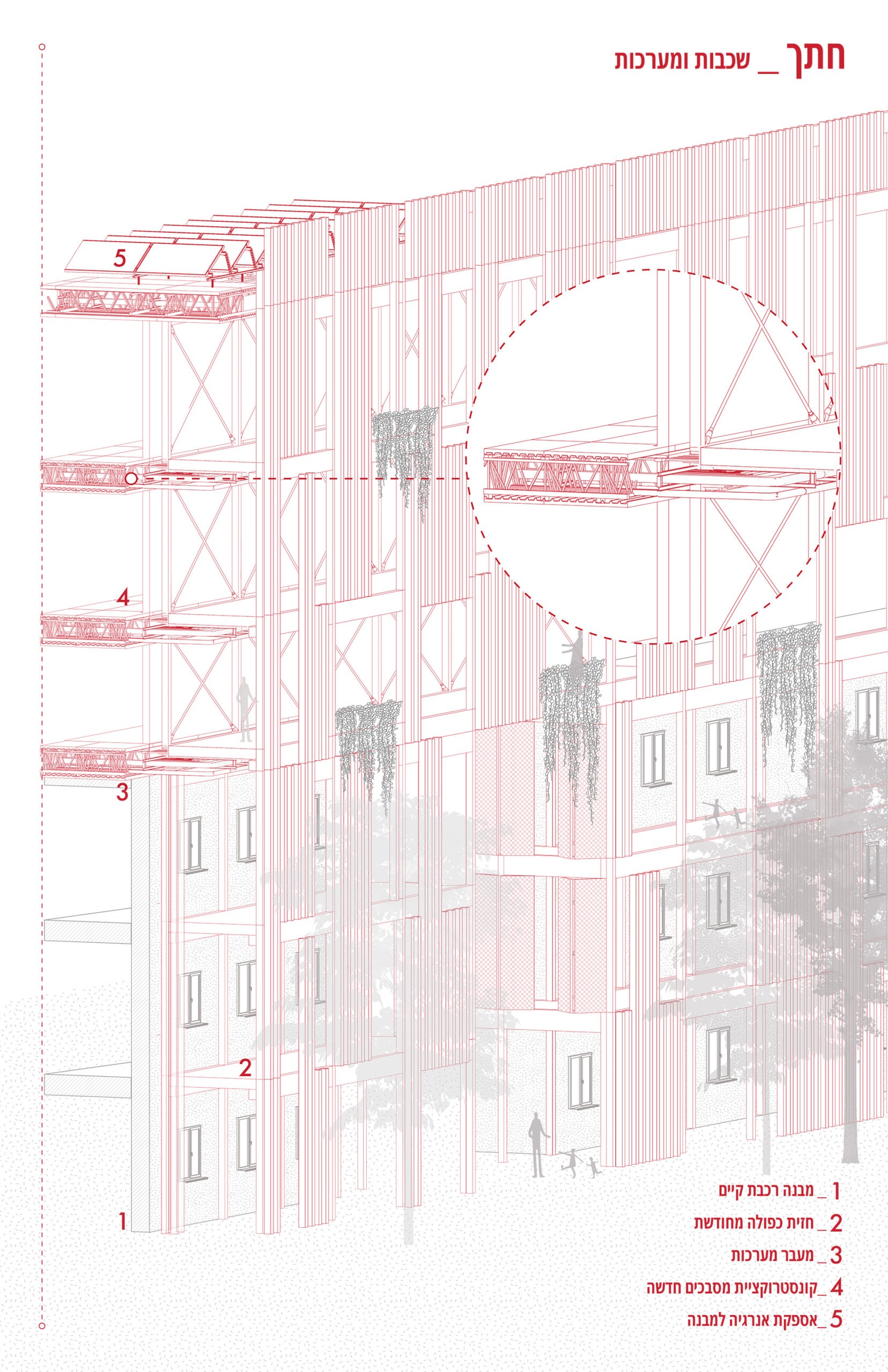 The project is explored through a case study in the Yad Eliyahu neighborhood of Tel Aviv, where the typical railway housing blocks serve as a testing ground for examining how the modular system can integrate into the urban context during both emergency and routine conditions.