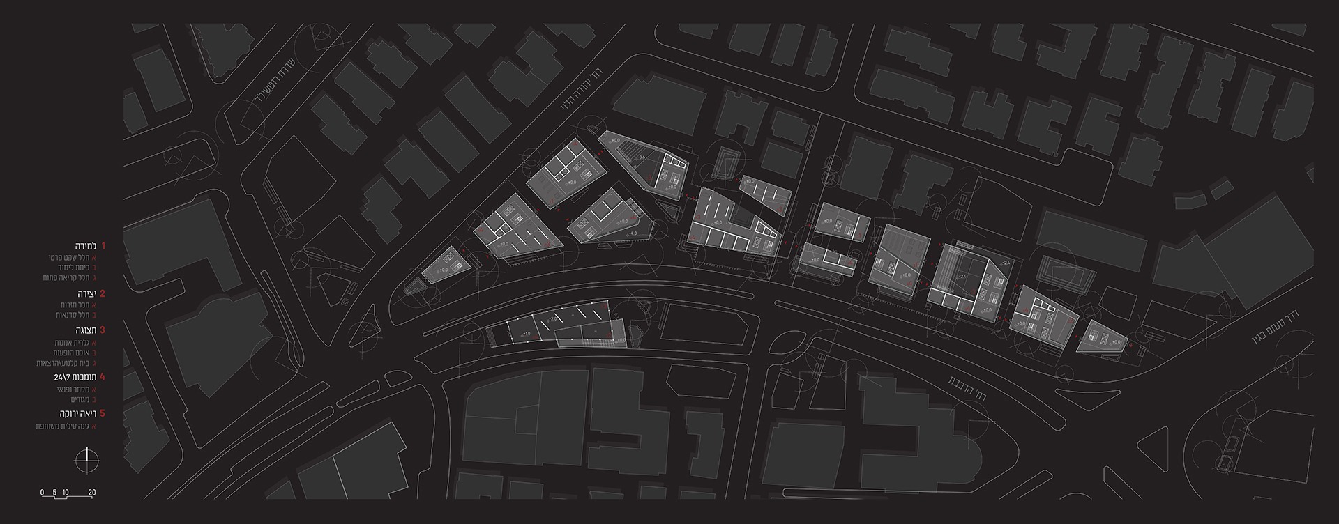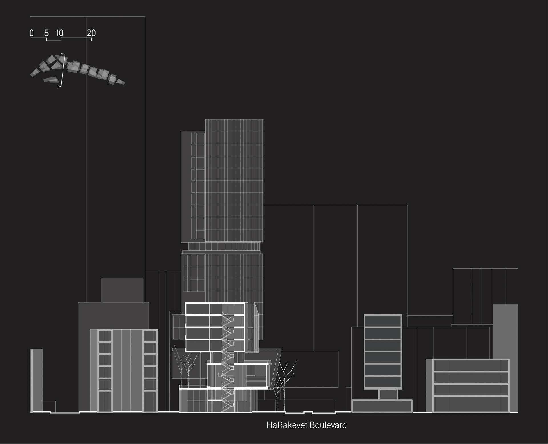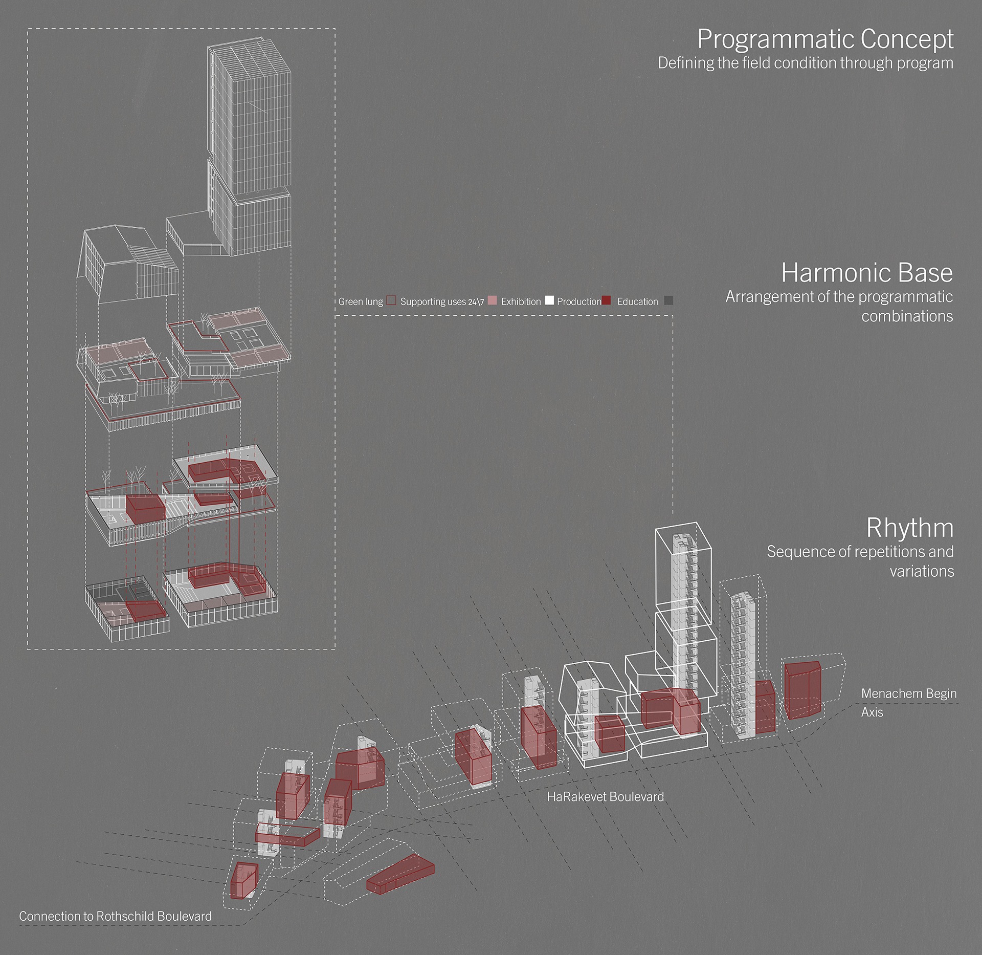 My graduation project explores how architecture can act as a living system rather than an isolated object. I was inspired by the dynamics of jazz: its rhythm, harmony, improvisation, and dialogue, as a framework for rethinking cultural and urban design. Just as jazz thrives on interaction between instruments, cities can only flourish through active relationships between their spaces and institutions. The project is located at Beit HaDar site in Tel Aviv, a 30 dunam former parking lot on the grounds of the historic South Railway Station. Surrounded by major boulevards and diverse neighborhoods, the site today functions as a void in the metropolitan fabric. Its strategic position offers the opportunity to transform this gap into a cultural and community hub that stitches together the surrounding urban flows. The design translates jazz principles into architectural tools: repetition and variation, moments of climax, and continuous dialogue. A grid of “musical measures” organizes masses and open spaces into rhythmic sequences, while programmed combinations of learning, creation, and exhibition foster interaction. The result is a metropolitan cultural center that does not stand apart, but acts as a tipping point, a catalyst for connection, resonance, and urban vitality.